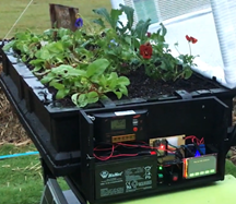 Pictured is one of our smart irrigation controllers kitted out with solar power, Sturdy marine ply housing to conceal a 30 Litre water tank and add further weather proofing, water tank can be have liquid fertiliser mixed in to irrigate with nutrient rich water. It is connected a Vegepod planted with thriving kale, silverbeet, beetroot and viola flowers.
